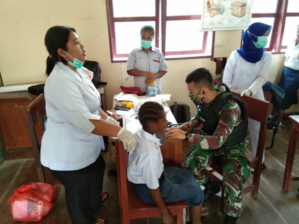 Keerom – Personil kesehatan Pos Ubrub Satgas Pamtas Yonif 312/Kala Hitam bekerjasama dengan Puskesmas Ubrub melaksanakan bakti kesehatan berupa pemeriksaan kesehatan terhadap murid SMP 1 Web di Kampung Umuaf, Distrik Web, Kabupaten Keerom, Papua. Senin (14/09/2020).