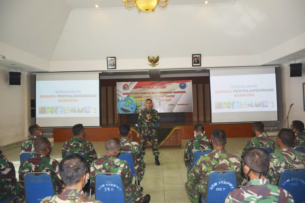 Kasi Intel dalam sosialisasinya mengatakan bahwa sosialisasi bahaya Narkoba kepada prajurit TNI dan PNS Korem 172/PWY merupakan suatu upaya Korem 172/PWY dalam rangka mewujudkan personel prajurit Korem yang mampu berfikir sehat dengan tidak menggunakan barang haram narkoba tersebut.
