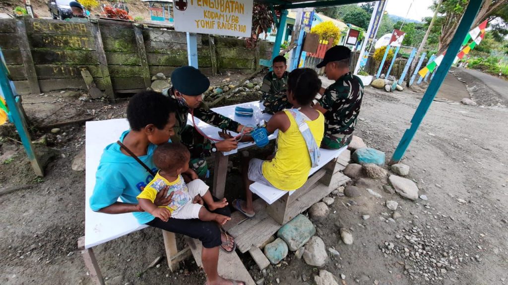 Keerom-Mengutamakan kesehatan masyarakat diperbatasan dengan latar belakangi terbatasnya sarana dan prasarana kesehatan, dengan demikian Satgas Pamtas RI-PNG Yonif Raider 100/Prajurit Setia Pos Waris melaksanakan pelayanan kesehatan dan pengobatan gratis kepada masyarakat Kampung Banda, Kab. Keerom, Provinsi Papua. Sabtu, (29/08/2020)