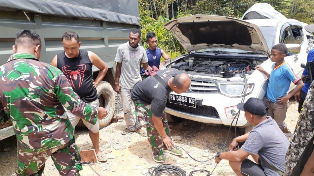 Keerom – Pos Yuruf Satgas Pamtas Yonif 312/Kala Hitam membantu perbaikan mobil warga yang mogok pada saat melintasi jalan di Kampung Amgotro, Distrik Yaffi, Kabupaten Keerom, Papua. Senin (14/09/2020).