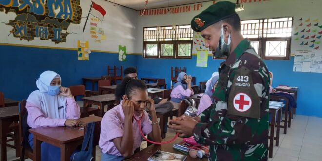 (Jayapura-Papua). Satgas Pamtas RI-PNG Yonif Mekanis Raider 413 Kostrad Pos Ramil Tami memberikan materi pengetahuan tentang kesehatan kepada Siswa SMAN 6 Skouw Jayapura. Demikian disampaikan Dansatgas Pamtas RI-PNG Yonif MR 413 Kostrad Mayor Inf Anggun Wuriyanto, S.H., M.Han dalam konfirmasinya di Distrik Muara Tami, Kota Jayapura, Papua, Rabu (09/09/2020).