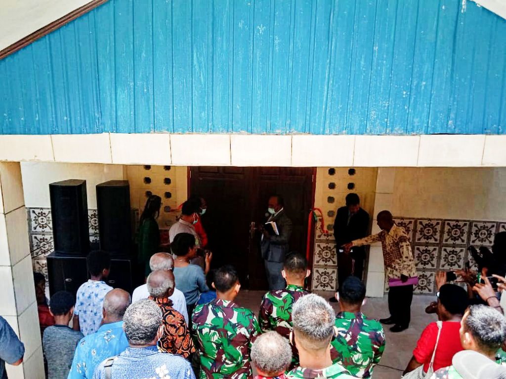 Keerom – Personel Satgas Yonif Raider 100/PS Pos Workwana bersama dengan Wakil Bupati Keerom Bapak Piter Gusbager meresmikan Gereja Pentakosta di Kampung Workwana.