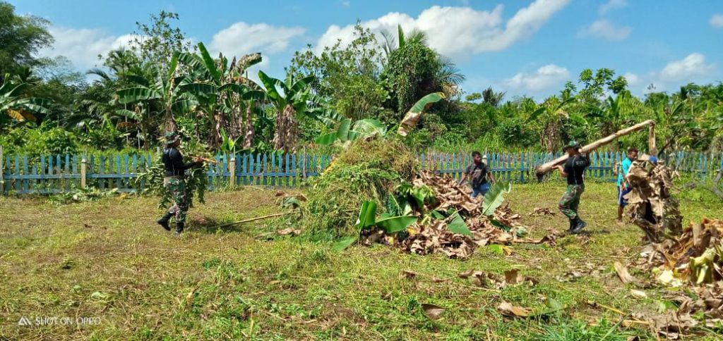 Kegiatan tersebut di pimpin oleh sertu Adik Syahwanto bersama 10 orang anggota Pos Wambes dan masyarakat bergotong royong melaksanakan kerja bakti di TK Intan Permata .”Setelah beberapa minggu terakhir melaksanakan libur karena pandemi Covid-19 ,rumput rumput yang ada di halaman sekolahpun mulai nampak panjang,maka dari itu kami anggota pos mengajak warga kampung membersih kan rumput tersebut” kata Adik syahwanto.