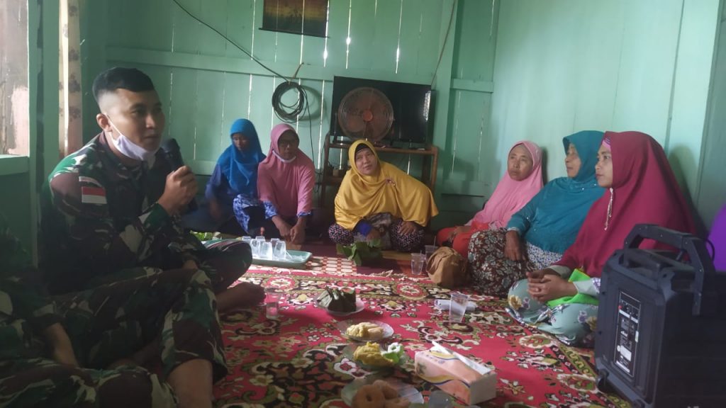 Keerom – Sebagai wujud kemanunggalan TNI dengan rakyat, Prajurit Pos Kout Satgas Pamtas Yonif 312/Kala Hitam menghadiri kegiatan pengajian ibu-ibu di Kampung Workwana, Distrik Arso, Kabupaten Keerom, Papua. Jumat (25/09/2020).