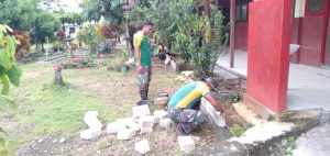 Satgas Pamtas RI-PNG Yonif Mekanis Raider 413 Kostrad Pos Ramil Tami bersama perangkat guru membuat taman sekolah guna mempercantik lingkungan...