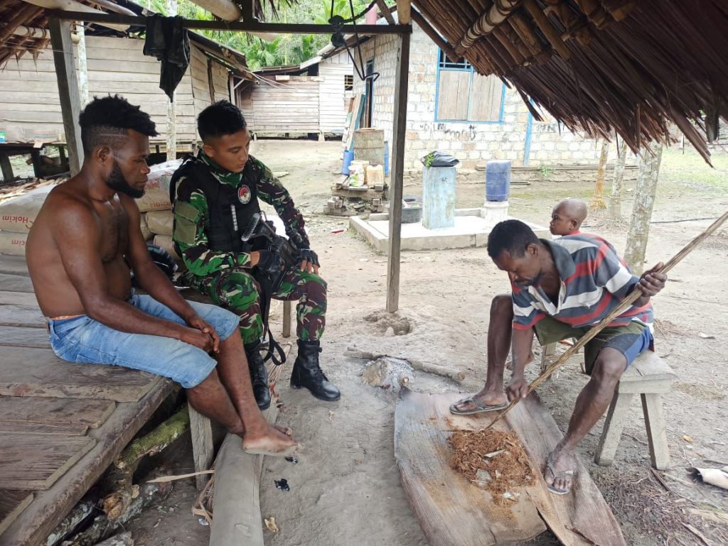 Keerom-Sebagai sarana mempererat tali silaturahmi dan dekat dengan masyarakat di perbatasan RI-PNG, Satgas Pamtas Yonif Raider 100/PS Pos Ampas secara rutin melaksanakan anjangsana ke rumah warga, salah satunya di rumah Bapak Simon (52) tepatnya di Kampung Ampas, Kabupaten Keerom, Provinsi Papua. Jumat, (02/10/2020).