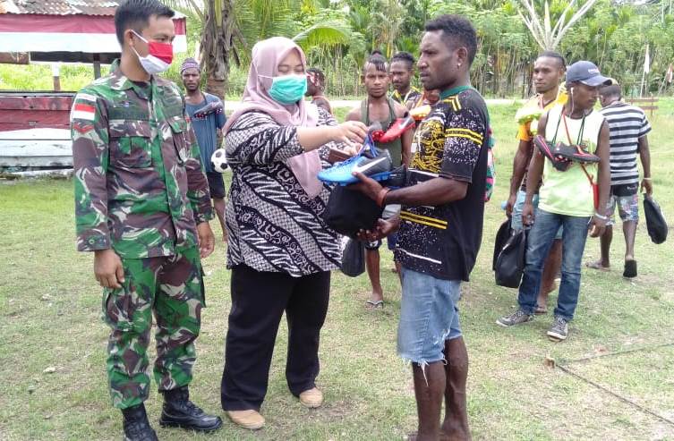 Dalam upaya mewujudkan pemuda Papua yang sehat dan berprestasi, Satgas Pamtas RI-PNG Yonif Mekanis Raider 413 Kostrad Pos Mosso bersama Yayasan YP2M Papua membagikan sepatu bola di Kampung Mosso Distrik Muara Tami Kota Jayapura.