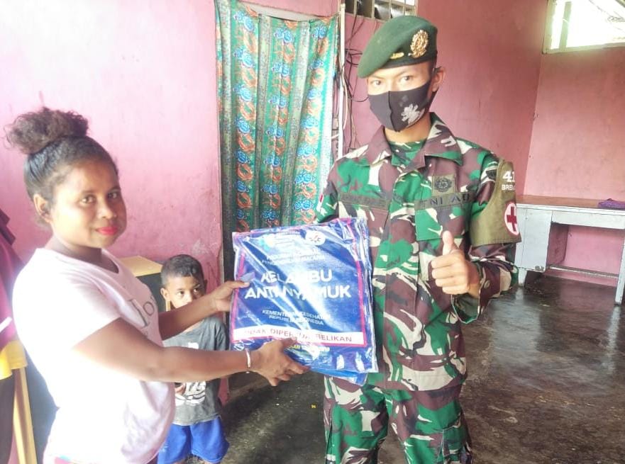 Dalam upaya membantu pemerintah menekan angka malaria di Provinsi Papua, Satgas Pamtas RI-PNG Yonif Mekanis Raider 413 Kostrad membagikan Kelambu berinsektisida kepada masyarakat Kampung Yowong Distrik Arso Barat Kabupaten Keerom.