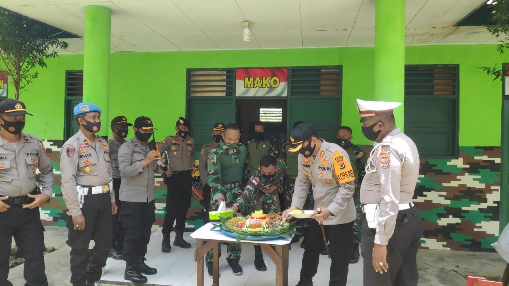 Keerom-Satgas Pamtas RI-PNG Yonif Raider 100/PS yang sedang berada di daerah penugasan sektor Utara Papua, dapatkan kejutan dari Kapolres Keerom AKBP Baktiar dan jajarannya kepada Dansatgas Yonif Raider 100/PS Mayor Inf M. Zia Ulhaq di Hari Ulang Tahun TNI ke-75 dengan berkunjung langsung ke Pos (Komando Taktis) Kotis untuk memberikan ucapan selamat disertai pemotongan tumpeng yang dibawa langsung oleh personel kepolisian sebagai bentuk ucapan selamat dan sinergitas TNI-Polri di Kampung Wonorejo, Distrik Mannem, Kabuoaten Keerom, Provinsi Papua. Senin,(05/10/2020).