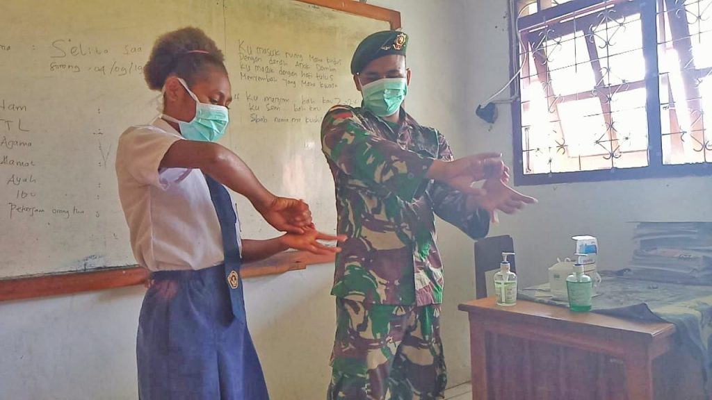 Satgas Pamtas RI-PNG Yonif Mekanis Raider 413 Kostrad turut membantu pemerintah dalam upaya pencegahan Covid-19 dengan cara memberikan sosialisasi kepada Siswa SMP Mahanaim Kampung Yetti Distrik Arso Timur Kabupaten Keerom.