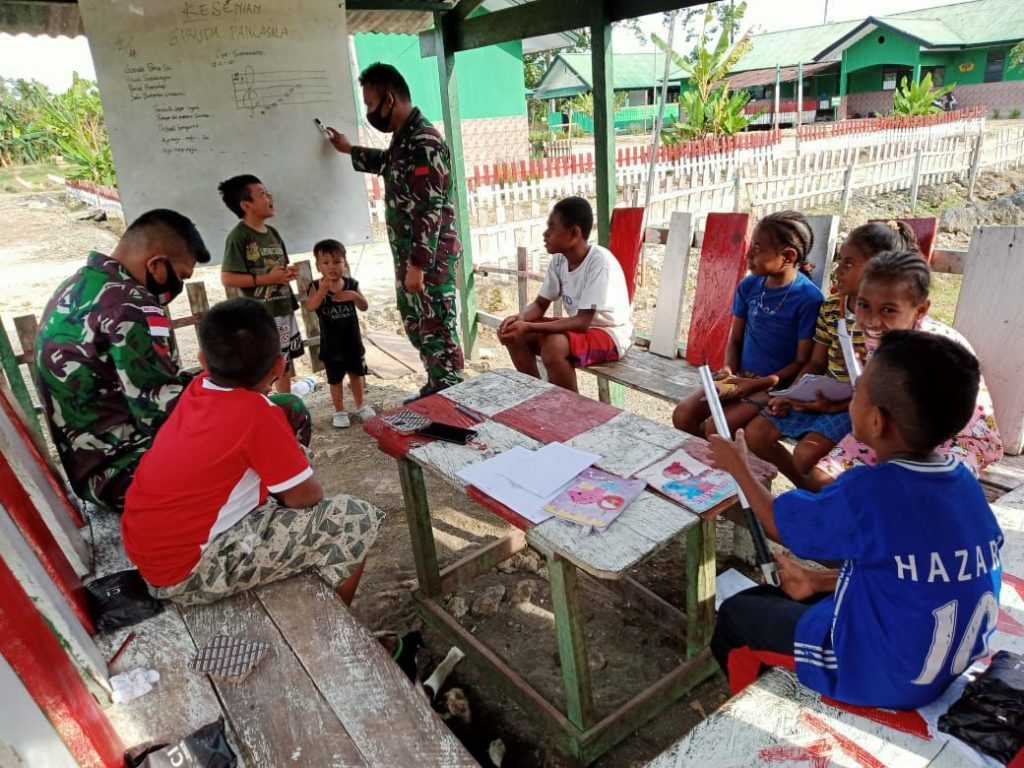 Keerom – Personel Pos Yamara Satgas Pamtas Republik Indonesia (RI)-Papua Nugini (PNG) Yonif Raider 100/PS memberikan Bimbingan Belajar (Bimbel) kepada anak-anak Kampung Yanemyo, Kabupaten Keerom, Provinsi Papua. Selasa,(20/10/2020).