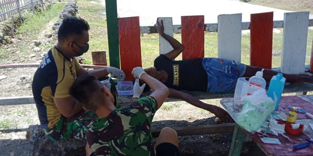 Menanggapi hal tersebut Tim kesehatan Pos Yamara Praka Nano dan Prada Yuman tanpa pikit panjang langsung menghampiri ibu tersebut, dilanjutkan pengobatan dengan memberikan obat antibiotik dan mendapatkan jahitan sebanyak 12 guna mempercepat proses penyembuhan luka tersebut, “Segera kita obati, agar lukanya tidak infeksi dan lekas sembuh, sehingga bisa beraktivitas kembali,” ucap Nano.