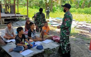 Keerom - Personel Pos Arso 13 Satgas Pamtas RI-PNG Yonif 100/PS di sela sela kegiatannya memberikan Bimbingan belajar kepada anak-anak...
