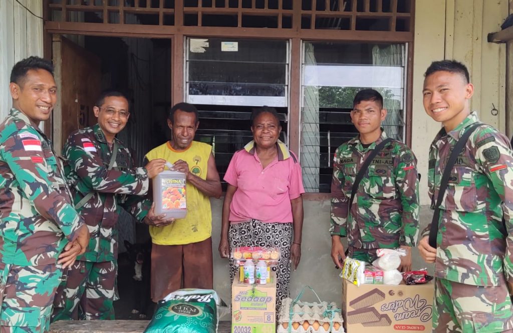 Keerom – Dalam rangka merayakan HUT TNI ke-75, Pos Kotis Satgas Pamtas Yonif 312/Kala Hitam memberikan bantuan paket sembako kepada Tokoh Agama di Kampung Senggi, Distrik Senggi, Kabupaten Keerom, Papua.
