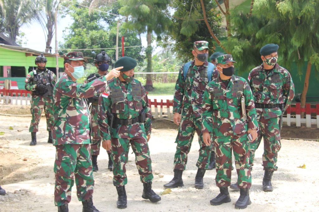 Keerom – Dansatgas Pamtas Yonif Raider 100/PS, Mayor Inf M. Zia Ulhaq beserta anggota dan staf menerima kunjungan Tim Pengawas Materil dan Operasi Markas Besar Angkatan Darat beserta rombongan di Pos Komando Taktis (Kotis) di Distrik Mannem, Kabupaten Keerom, Provinsi Papua. Selasa,(06/10/2020).