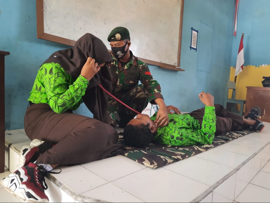 Satgas Pamtas RI-PNG Yonif Mekanis Raider 413 Kostrad Pos Ramil Tami memberikan materi Tanda-Tanda Vital (TTV) kepada Siswa SMAN 6 Skouw di Distrik Muara Tami Kota Jayapura.