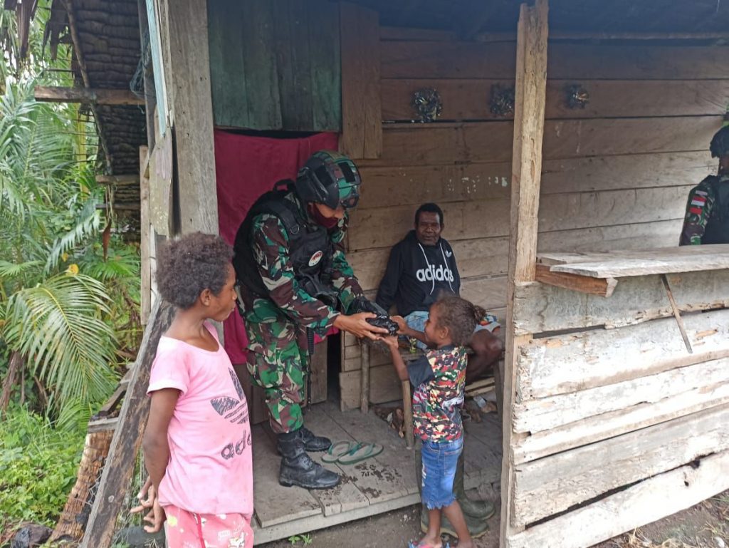 Keerom-Dalam rangka menjaga kemanunggalan antara TNI-Rakyat dan mempererat silaturahmi dan selalu dekat dengan masyarakat, Satuan Tugas Pengamanan Perbatasan (Satgas Pamtas) Yonif Raider 100/PS melakukan kegiatan anjangsana kerumah keluarga asuh Bapak Agus Mangga (61) selaku Tokoh masyarakat sekaligus memberikan pakaian layak pakai kepada masyarakat sekitar, Selasa (28/10/2020)