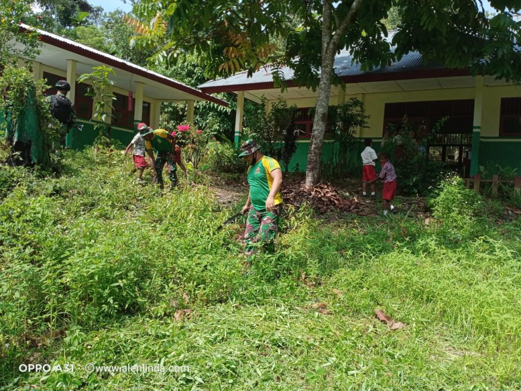 Bertempat di Kampung Yowong Distrik Arso Barat Kabupaten Keerom, Satgas Pamtas RI-PNG Yonif Mekanis Raider 413 Kostrad Pos Skamto membersihkan lingkungan Sekolah SD Inpres Yowong sekaligus membagikan gula-gula kepada siswa.