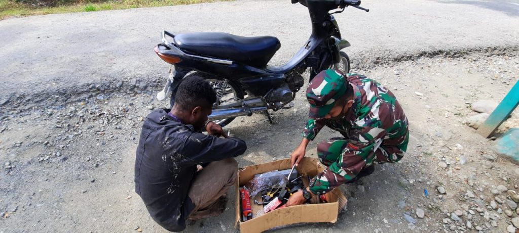 Keerom – Bentuk kepedulian kepada masyarakat di daerah perbatasan RI-PNG dimulai dari hal hal kecil, salah satunya aksi Satgas Pamtas RI-PNG Yonif Raider 100/PS Pos Waris yang membantu memperbaiki sepeda motor warga Kampung Paitenda, Diatrik Waris, Kabupaten Keerom, Provinsi Papua. Rabu,(30/09/2020).