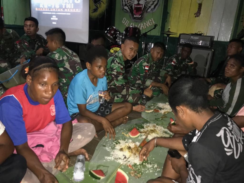 Keerom – Dalam rangka merayakan HUT TNI ke-75, Pos Kotis Satgas Pamtas Yonif 312/Kala Hitam mengajak unsur pemerintahan seperti Polsek, Koramil, Puskesmas dan warga perbatasan Makan botram Bersama di Kampung Senggi, Distrik Senggi, Kabupaten Keerom, Papua. Senin (05/10/2020).