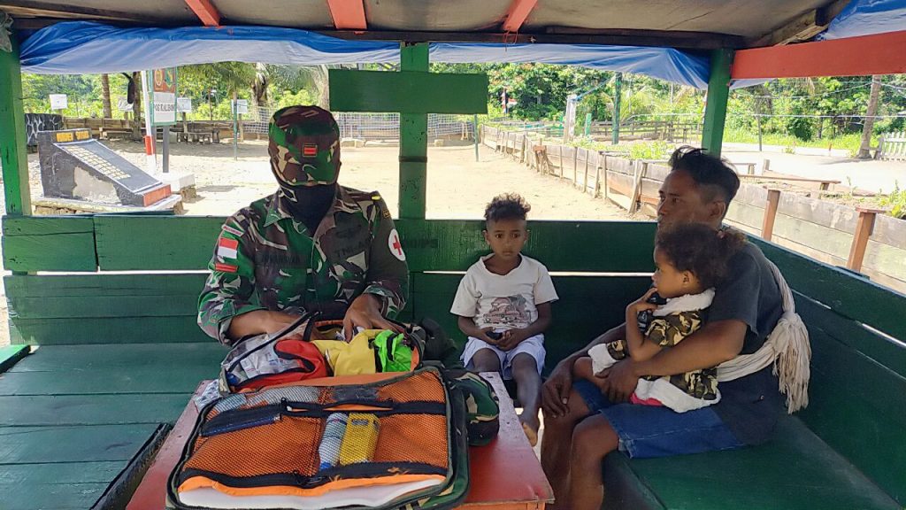Keerom – Jarak yang jauh serta medan yang sulit untuk ditempuh dalam mendapatkan pengobatan salah satu kendala masyarakat perbatasan khususnya Kampung Kalibom, maka kepedulian akan kesehatan masyarakat perbatasan Satgas Pamtas RI-PNG Yonif Raider 100/PS Pos Kalibom memberikan pelayanan kesehatan baik di dalam Pos maupun dengan keliling kampung, salah satunya adik Sera (7) yang diantar orangtuanya ke Pos Kalibom, Distrik Waris, Kabupaten Keerom, Provinsi Papua. Rabu,(18/11/2020).