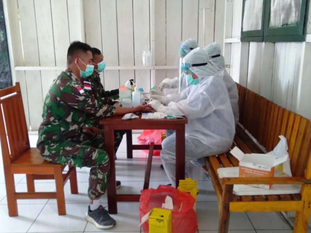 Pegunungan Bintang – Dalam rangka mencegah penyebaran virus Covid-19, Pos Oksibil Satgas Pamtas Yonif 312/KH bekerjasama dengan Dinkes Kabupaten Pegunungan Bintang melaksanakan rapid test terhadap personil Pos Oksibil di Kampung Oksibil, Distrik Serambakon, Kabupaten Pegunungan Bintang, Papua.