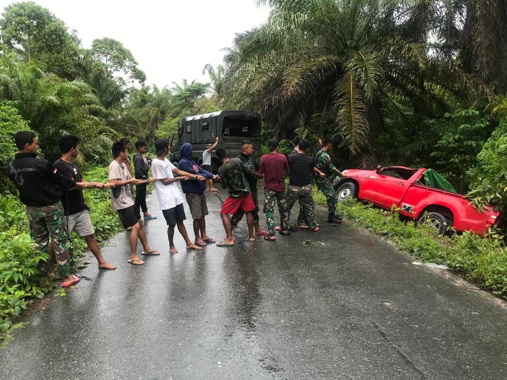 “Anggota langsung menuju lokasi kemudian bersama beberapa warga melakukan evakuasi kendaraan, karena kondisi mobil yang terbalik evakuasi dilakukan dengan menghadirkan truk dinas TNI untuk menarik mobil yang masuk ke parit,” tutur Negi.