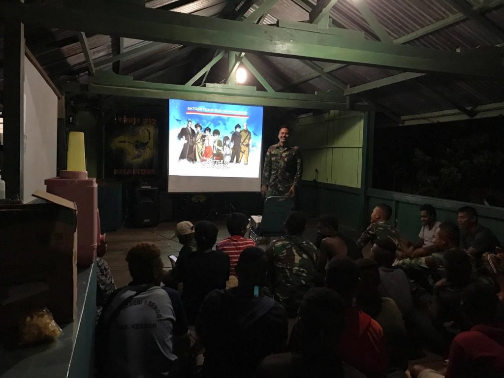 Keerom – Masih dalam rangka memperingati Hari Pahlawan Nasional, Pos Kotis Satgas Pamtas Yonif 312/Kala Hitam mengajak anak-anak perbatasan untuk nonton bareng film “The Battle Of Surabaya” di Kampung Senggi, Distrik Senggi, Kabupaten Keerom, Papua.