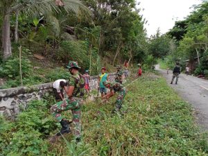 Keerom- Satgas Pamtas RI-PNG Yonif Raider 100/PS Pos Karang bersama warga melaksanakan karya bhakti dalam hal ini membersihkan pinggiran jalan...