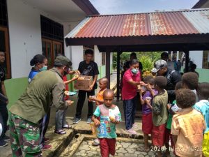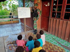 Satgas Pamtas RI-PNG Yonif Mekanis Raider 413 Kostrad menghias PAUD di Kampung Pitewi Distrik Arso Timur Kabupaten Keerom dengan membuat...