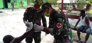 Satgas Pamtas RI-PNG Yonif Mekanis Raider 413 Kostrad membantu warga Kampung Mosso Distrik Muara Tami Kota Jayapura yang mengalami kecelakaan...