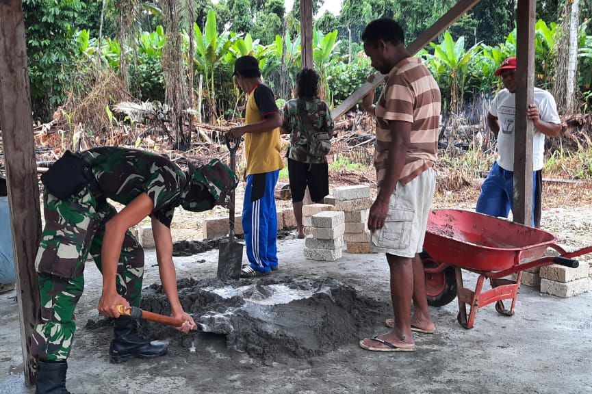 Keerom – Sebagai implementasi pembinaan teritorial Satgas Pamtas Yonif Raider 100/PS di wilayah perbatasan dan Sebagai bentuk pengabdian dan perhatian di medan tugas dalam menjaga perbatasan wilayah perbatasan RI-PNG, Personel Satgas Pamtas Yonif Raider 100/PS Pos Yamara melaksanakan karya bakti membantu warga dalam pembangunan balai desa Kampung Para para, Kabupaten Keerom, Provinsi Papua. Jumat, (06/11/2020).