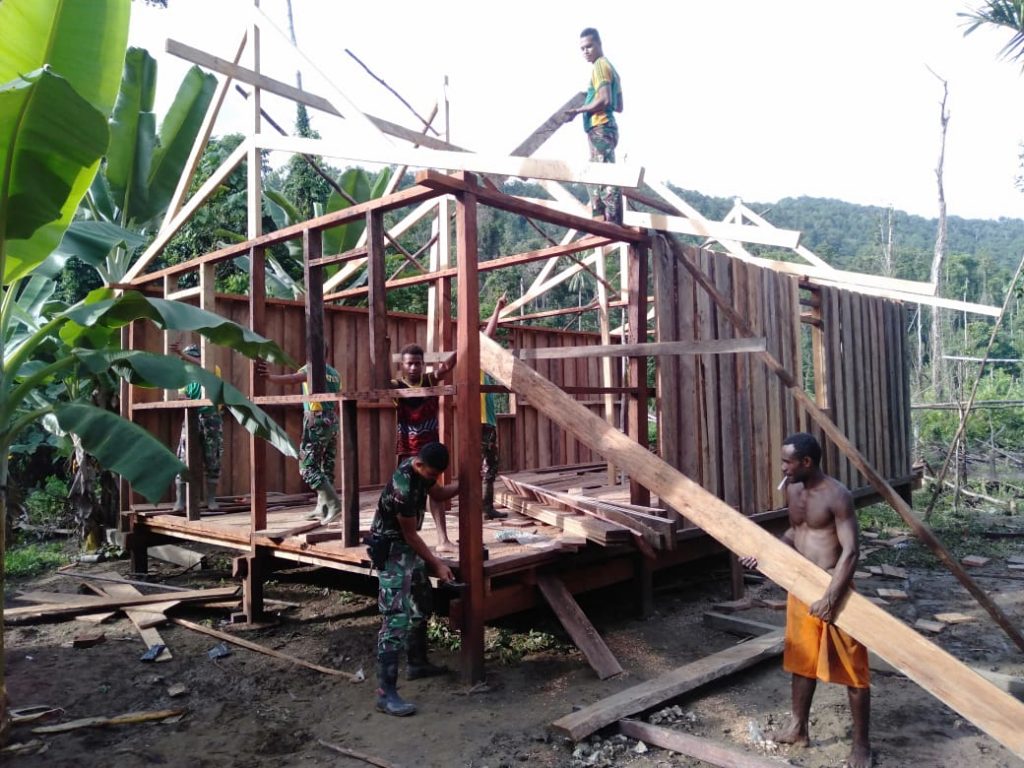 Satgas Pamtas RI-PNG Yonif Mekanis Raider 413 Kostrad Pos Scofro Baru merintis pembuatan Gereja di Kampung Kufu Distrik Arso Timur Kabupaten Keerom.