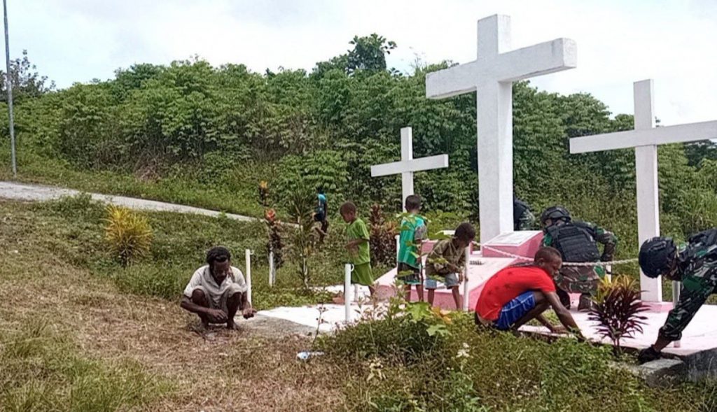 Keerom – Budayakan semangat gotong royong ditengah tengah masyarakat, Personel Satgas Pamtas RI-PNG Yonif Raider 100/PS Pos Yabanda melalui aksinya bersama sama dengan masyarakat membersihkan tugu Salib dan lingkungan Kampung Yabanda, Diatrik Yaffi, Kabupaten Keerom, Provinsi Papua. Jumat, (20/11/20).