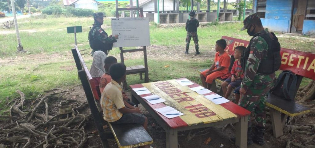 Keerom-Berbagai cara dilakukan dalam upaya menciptakan generasi penerus yang berkarakter dan berpendidikan khususnya diperbatasan RI-PNG Sektor Utara, prajurit TNI dari Satgas Pamtas RI-PG Yonif Raider 100/PS Pos Arso 13 memberi les atau Bimbingan belajar (Bimbel) kepada anak-anak SD Negeri Arso 13 di Kampung Naramben yang memiliki waktu terbatas ke sekolah ditengah Pandemi Covid-19, sehingga mengharuskan belajar dirumah.