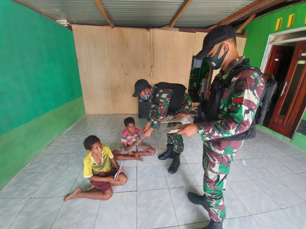 Keerom – Satgas Pamtas RI-PNG Yonif Raider 100/PS Pos Waris membagikan buku tulis dan buku bacaan kepada anak-anak Kampung Banda, Distrik Waris, Kabupaten Keerom, Provinsi Papua. Selasa,(17/11/2020).