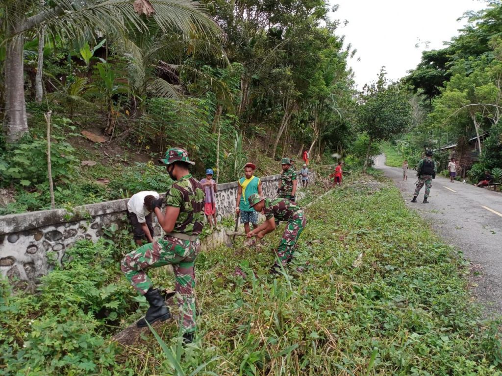 Keerom- Satgas Pamtas RI-PNG Yonif Raider 100/PS Pos Karang bersama warga melaksanakan karya bhakti dalam hal ini membersihkan pinggiran jalan dan parit sepanjang jalan Kampung Yuwainda, Distrik Waris, Kabupaten Keerom, Provinsi Papua. Minggu,(22/11/2020).