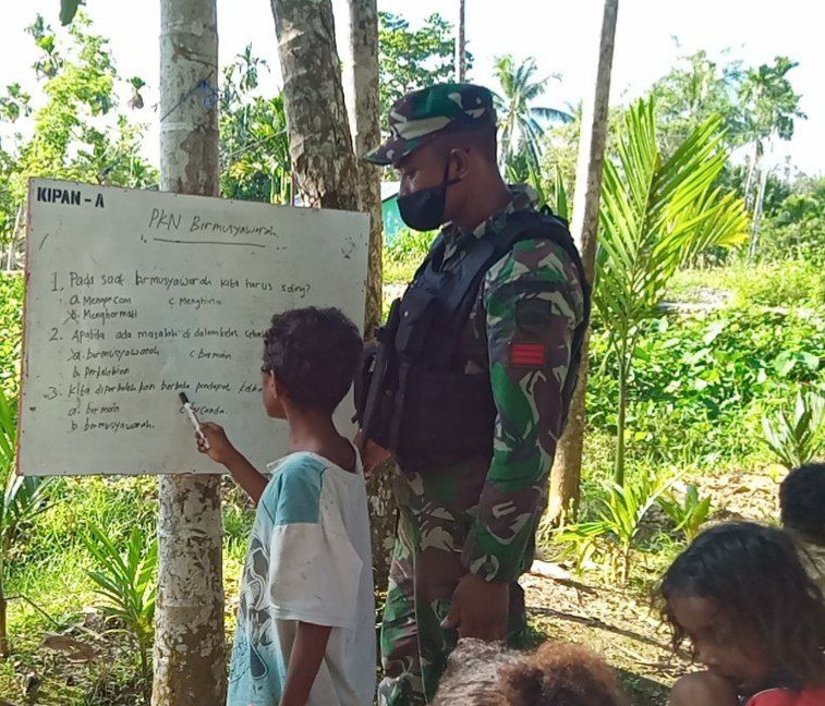 Dijelaskannya, seperti seorang guru, salah satu personel satgas memberikan beberapa pembekalan mata pelajaran ke beberapa anak yang saat ini berkumpul di kampung,