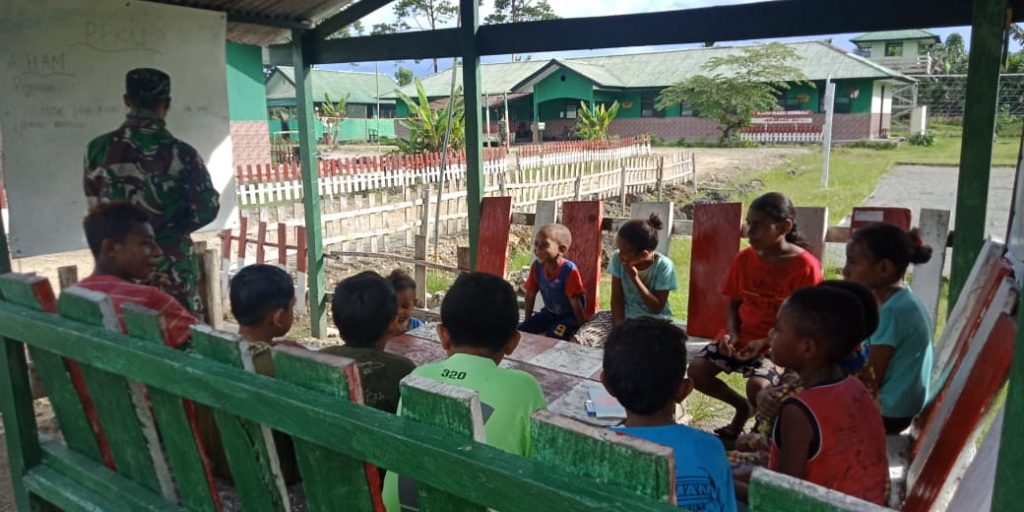 Keerom – Layaknya seorang guru, salah satu personel satgas memberikan beberapa pembekalan mata pelajaran guna meningkatkan kualitas pelajar yang saat ini berada ditengah Pandemi Covid-19, kepedulian TNI di perbatasan tentang dunia pendidikan, anggota Pos Yamara Satgas Pamtas RI-PNG Yonif Raider 100/PS memberikan pelajaran tambahan di luar kelas, kepada anak anak yang berada di Kampung Yanemyo, Distrik Mannem, Kabupaten Keerom, Provinsi Papua. Selasa,(1/12/2020).