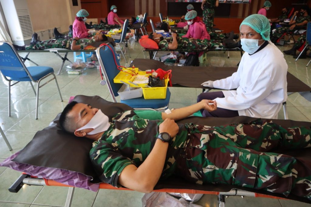 Jayapura-Dalam rangka menyambut Hari Juang Kartika (HJK) Ke-75 yang jatuh pada tanggal 15 Desember mendatang, Korem 172/Praja Wira Yakthi menggelar kegiatan donor darah yang diikuti oleh beberapa satuan di jajaran Korem 172/PWY dan instansi lain seperti Satuan Brimob di Aula Makorem 172/PWY, Kamis (10/12/2020).