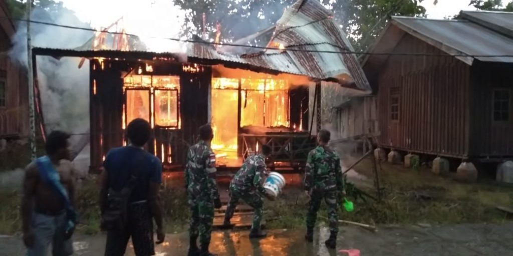 Seketika melihat kepulan asap hitam tersebut, sontak personel Pos Kalipao langsung bergerak cepat mendatangi Kampung tersebut, setibanya di lokasi ternyata salah satu rumah warga Bapak Silas Psebo (38) sudah dilahap oleh api, rumah tersebut sudah lama kosong di tinggal pemiliknya dan di jaga oleh keponakan korbannya bernama Boni Samof (19).