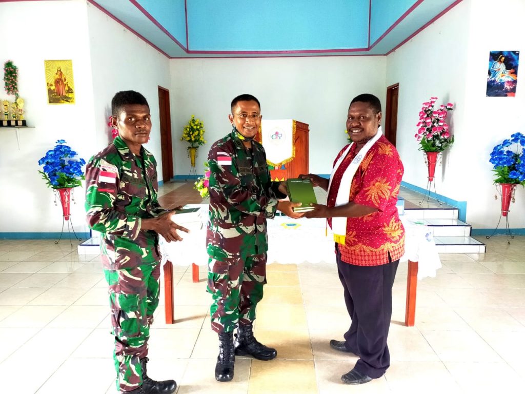 Menutup rangkaian ibadah Satgas Yonif 312/KH juga memberikan bantuan berupa buku rohani bagi jemaat gereja “semoga sedikit bantuan kami ini semakin meningkatkan keimanan dan ketakwaan jemaat,” tutup Priden.