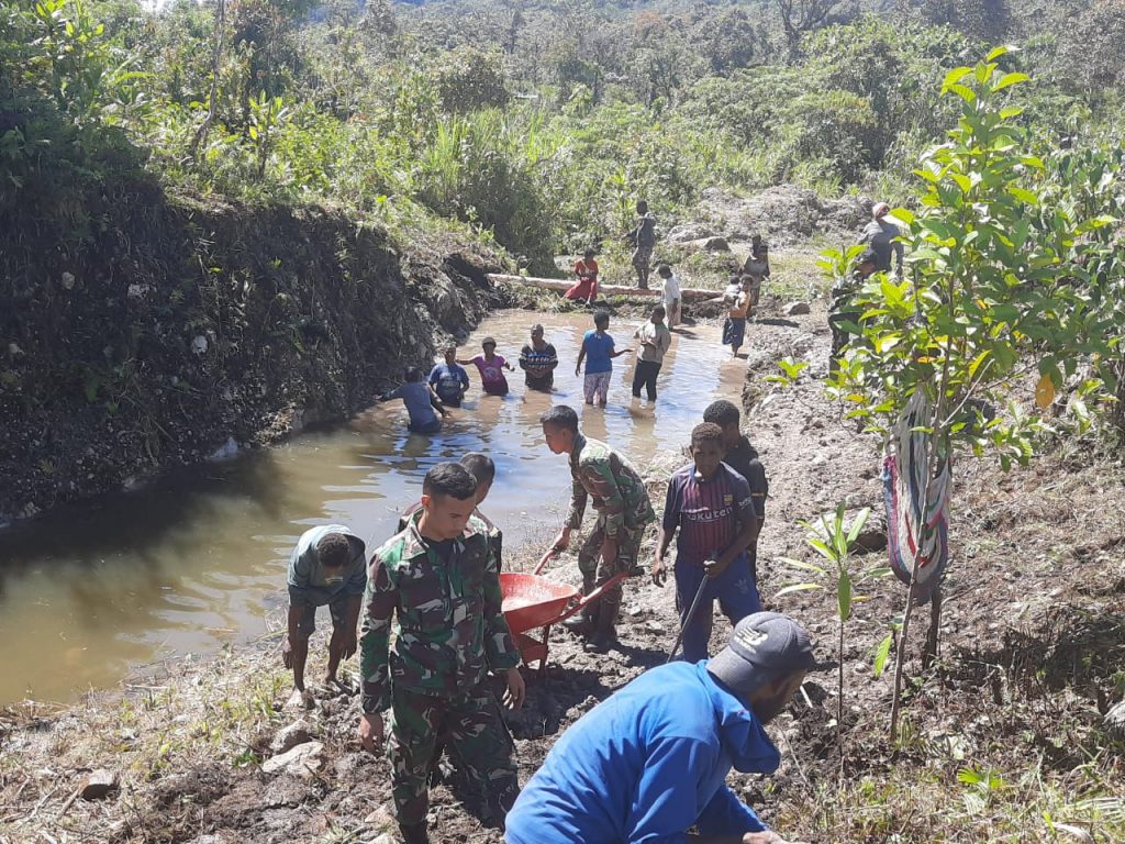 Pegunungan Bintang – Sebagai wujud kepedulian TNI terhadap kehidupan beragama masyarakat di Perbatasan, Pos Serambakon Satgas Pamtas Yonif 312/KH bersama warga bergandengan tangan menyiapkan kolam pembaptisan di Kampung Seramkatop, Distrik Serambakon, Kabupaten Pegunungan Bintang, Papua.