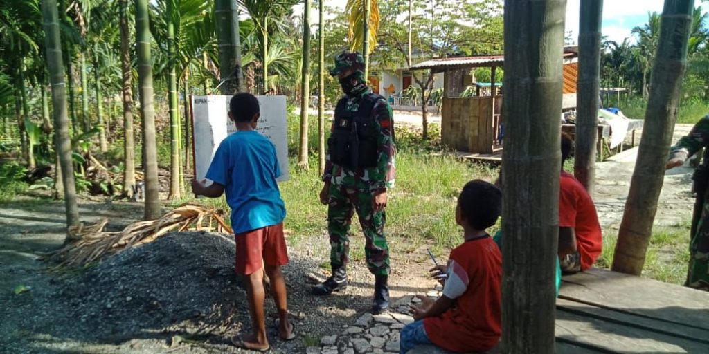 Keerom – Sukacita di bulan Desember menyambut Natal dan Tahun Baru membuat Satgas Yonif Raider 100/PS bergerak dalam rangka membantu meningkatkan pendidikan anak anak perbatasan RI-PNG ditengah kebijakan pemerintah yang mengharuskan anak-anak sekolah belajar di rumah karena dampak dari pandemi Covid-19, anggota Satgas Pamtas Yonif Raider 100/PS pada kesempatan kali ini Pos Yamara memberikan bimbingan belajar kepada anak-anak Papua salah satunya di Kampung Yanemyo, Distrik Mannem, Kabupaten Keerom, Provinsi Papua. Jumat,(04/12/2020).