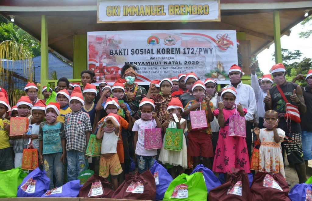“Dan sekarang kita buatkan gedung gereja agar masyarakat memiliki tempat yang layak untuk memuji Tuhan. Ini adalah kado natal dari TNI. Kemudian kita juga melaksanakan kegiatan Bakti Sosial dalam rangka menyambut perayaan Hari Natal serta dilaksanaan pembagian masker dan sosialisasi tentang protokol kesehatan Covid-19”, ujarnya.