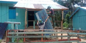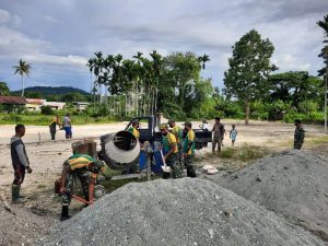 Satgas Pamtas RI-PNG Yonif Mekanis Raider 413 Kostrad Pos Kout KM 31 bersama masyarakat membangun lapangan volly dalam rangka mewujudkan...