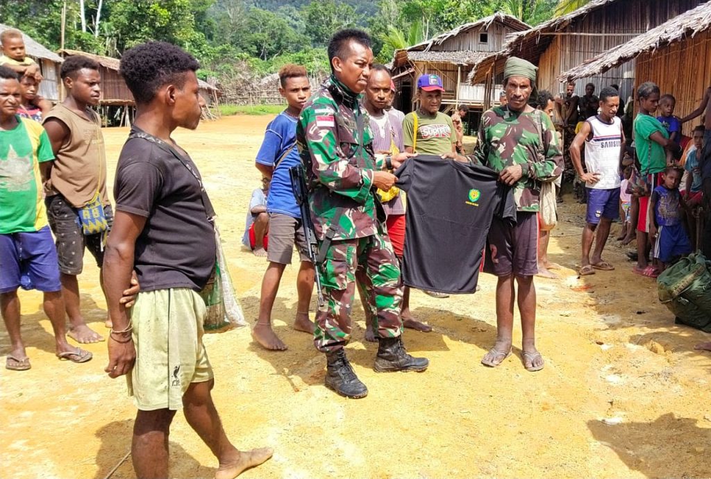 Keerom – Dalam rangka mewujudkan kemanunggalan TNI dan rakyat, Pos Tatakra Satgas Pamtas Yonif 312/Kala Hitam melaksanakan kegiatan anjangsana sekaligus membagikan kaos Siliwangi di Kampung Toale, Distrik Web, Kabupaten Keerom, Papua.