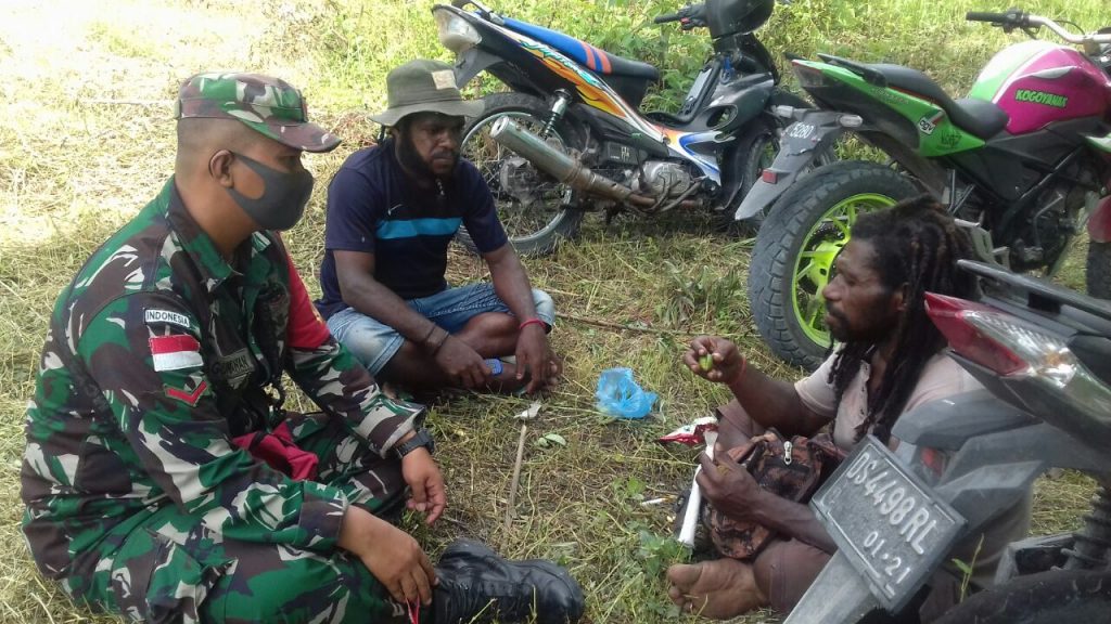 Dalam kesempatan ini Kopda Agunawan berbincang dengan Yosia Wenda dan Son Wenda yang mana mereka adalah tokoh pemuda Kampung Gudang Garam.