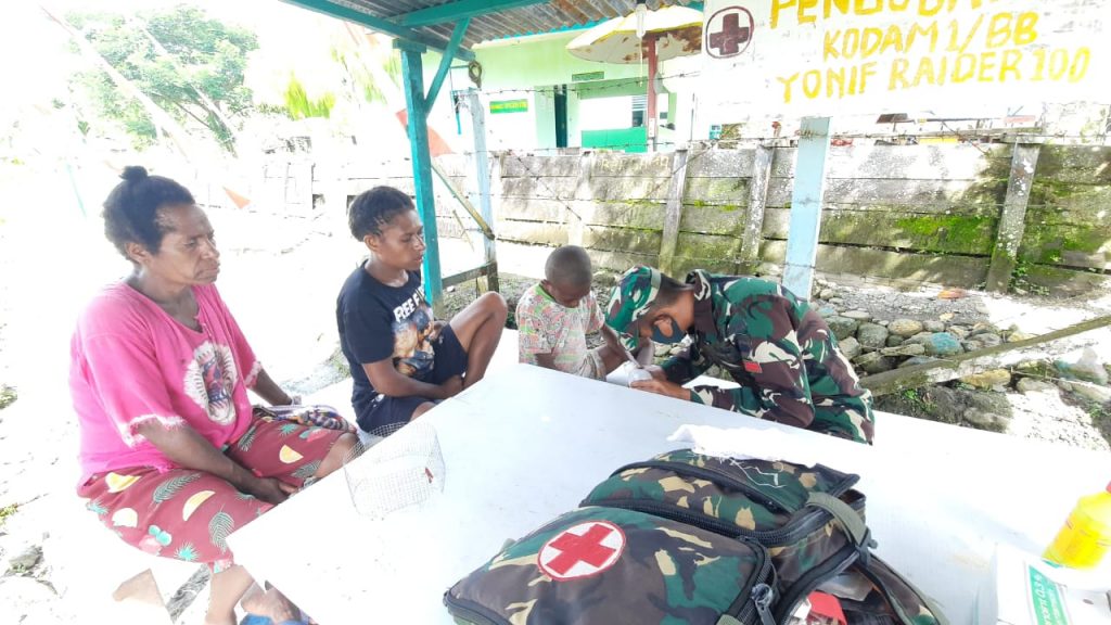 Keerom – Satgas Yonif Raider 100/PS hadir di tengah tengah masyarakat, datang untuk membantu warga yang kurang mampu memberikan pelayanan khususnya di bidang kesehatan. Kesehatan merupakan faktor terpenting dalam setiap hidup manusia, oleh sebab itu Satuan Tugas (Satgas) Pamtas Yonif Raider 100/PS Pos Ampas dengan senang hati melakukan pelayanan kesehatan bagi warga Kampung Banda, Distrik Waris, Kabupaten Keerom, Provinsi Papua. Jumat,(22/01/2021).