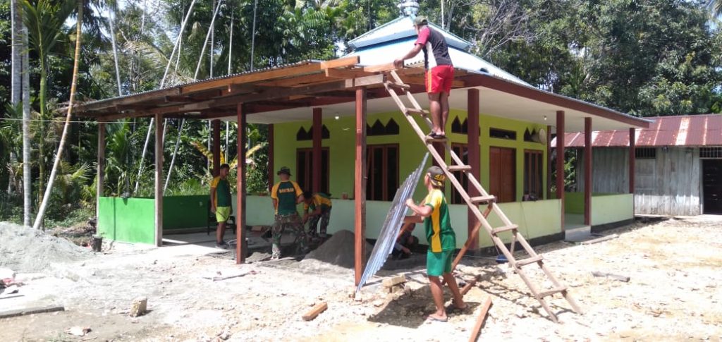 Satgas Pamtas RI-PNG Yonif Mekanis Raider 413 Kostrad Pos Ramil Tami melaksanakan karya bhakti dengan masyarakat secara bergotong royong membangun teras Masjid Al-Hikmah di Kampung Skouw Mabo Distrik Muara Tami Kota Jayapura.